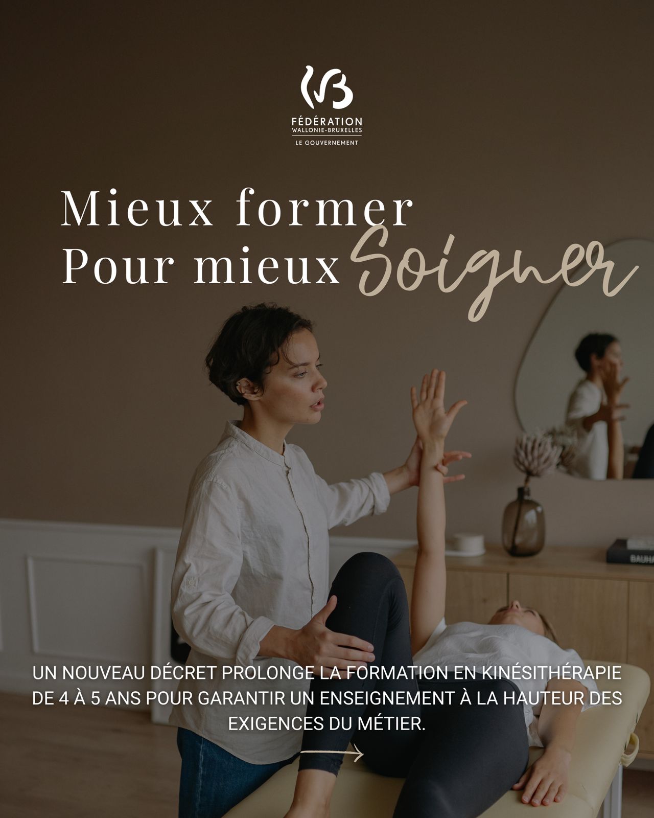 « Cet allongement des études souhaité et attendu par tous depuis plus de 10 ans est devenu indispensable. De la sorte nous repensons le contenu de la formation et répondons aux exigences imposées très prochainement par le fédéral pour le futur accès direct aux soins, sans obligation de prescription médicale préalable, pour les kinés. J’ai initié il y a quelques mois les discussions et concertations avec les universités et hautes-écoles sur le sujet. Je